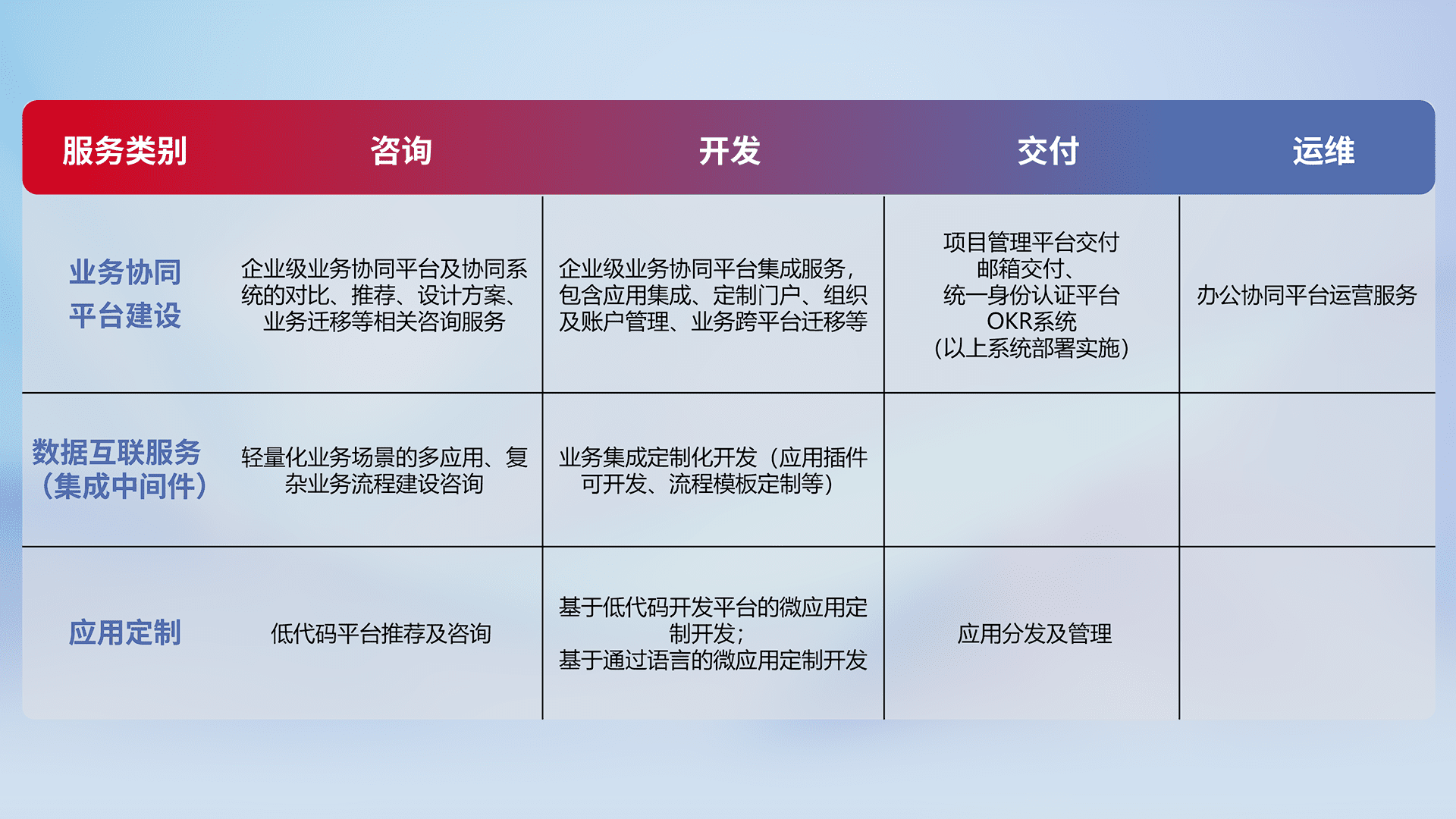 针对钉钉、、、企微、、、、IDaas等平台级产品提供产品的规划、、、、方案、、、交付、、、、定制化开发等服务,,,实现如统一协同办公、、智能客户服务、、混合会议管理、、、智能数据查询、、、等业务场景,,实现数字化转型。。。