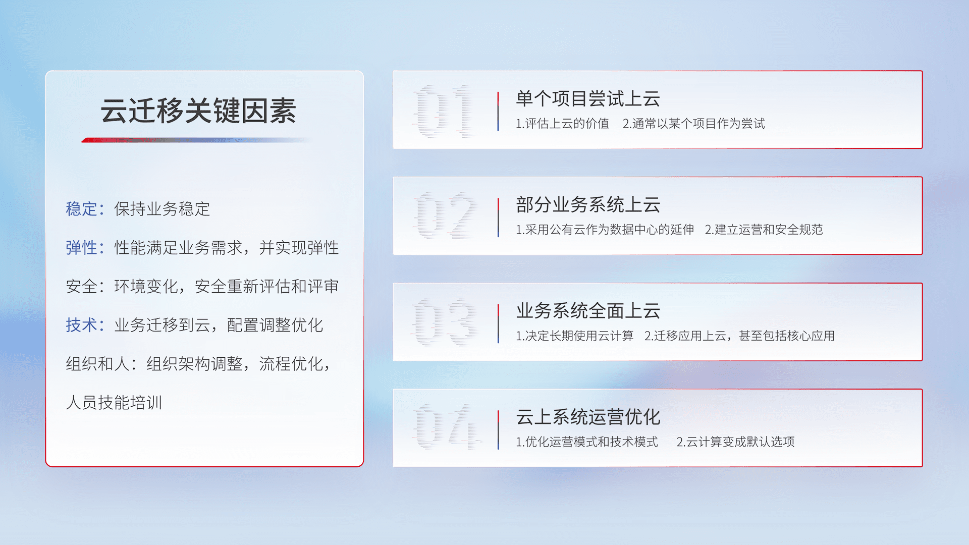 结合实际业务,,,从规划设计、、、云平台选型、、、云原生改造、、、数据迁移、、集成交付,,,,迁移全过程为客户识别最佳上云路径,,,做好风险识别管理,,,设计网络架构、、、身份权限、、安全审计合规、、、、操作审计、、、、日志审计、、、监控告警策略、、、、多站点容灾设计等,,,,对云上基础设施进行整体规划,,,提升IT治理水平,,,以满足弹性、、、高可用、、、、高性能的需求。。。