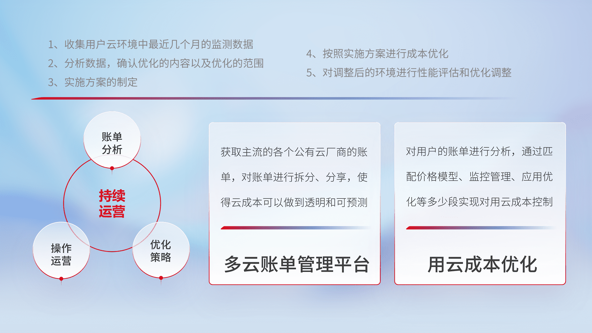 通过多云纳管,,以统一的资源数据模型把客户的云资源进行抽象和封装,,进而实现对多云资源的统一操作,,,保障云资源管理的可靠性、、稳定性与可用性。。。量身定制化运维内容,,,,配置、、开发运维、、、补丁管理、、、备份、、监控、、、、认证和访问管理、、、、审计和日常巡检等,,保障在用云过程中的可靠度,,,,稳定度以及高可用率。。。